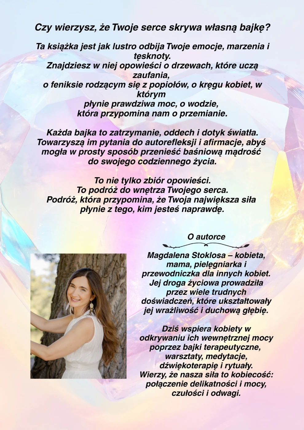 „Bajki terapeutyczne. Opowieści serca i duszy” to zbiór symbolicznych historii, które dotykają głębokich emocji i pomagają odnaleźć spokój, odwagę i sens. Każda opowieść jest jak lustro, które odbija Twoje doświadczenia i prowadzi Cię w stronę większej harmonii.